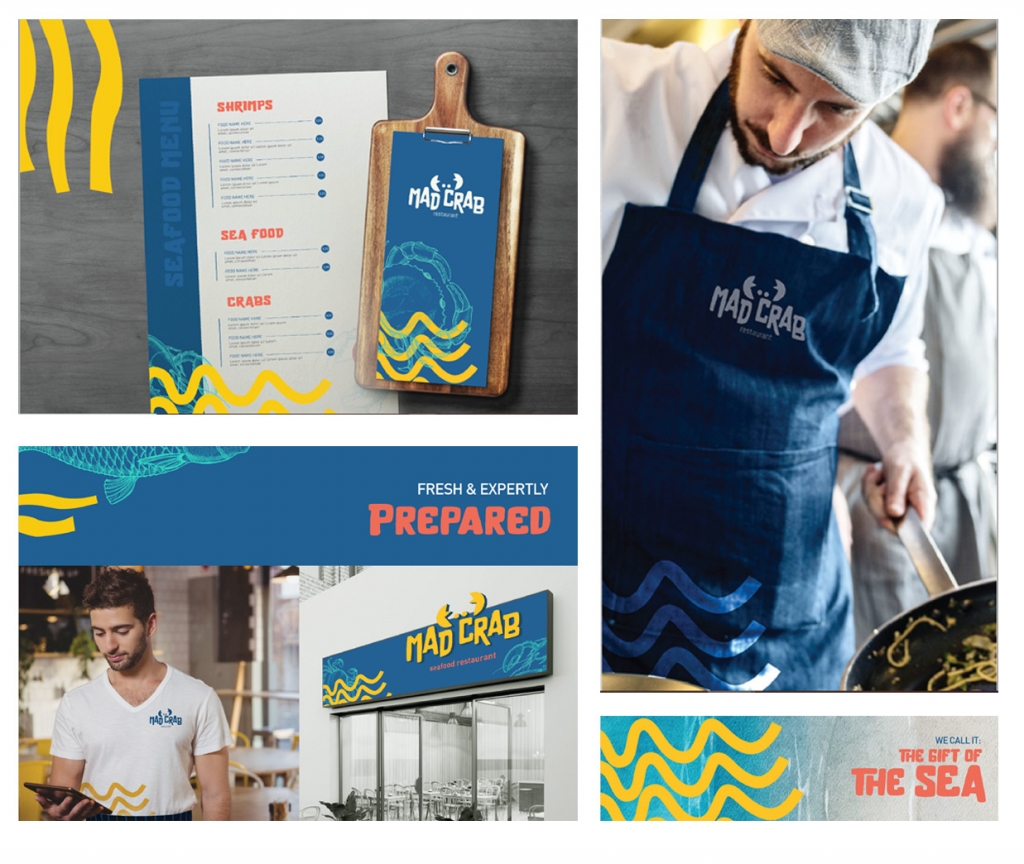 Project Mad Crab was created as a brand that conveys the freshness of the sea, a place to enjoy delicious Seafood with your friends and family. Thus creating a playful nautical theme for brand identity. This was in-line with the all-encompassing brief for this new hospitality venture, and together we developed a subtly branded restaurant interior design that offers a relaxed dining experience for those who enjoy good quality seafood. With the maritime theme in mind, the branding and interior design of the restaurant is inspired by life under the sea, colorful, lively and a little bit mysterious combining the elements such as aquatic blue, yellow, turquoise, and burnt orange spread across the walls and exposed timber and metal finishes.
